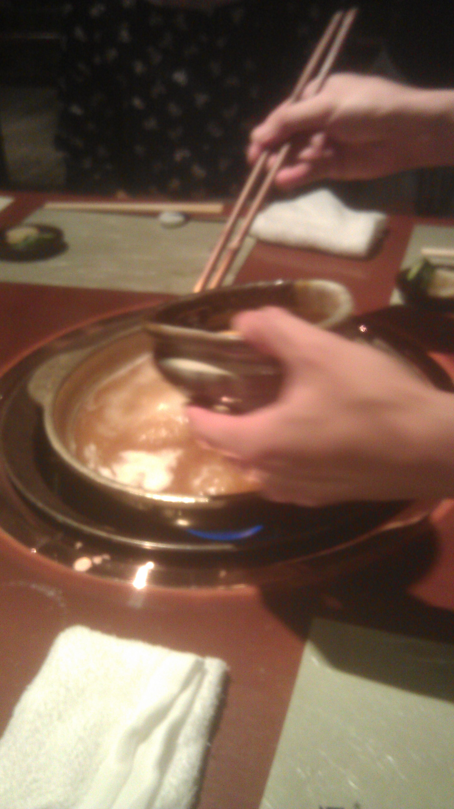 In der Mitte vom Tisch war ein Loch mit einer Kochflamme und in eine Schüssel wurde eine Art Suppe geschüttet. Hier kamen Möhren und Pilze hinein.